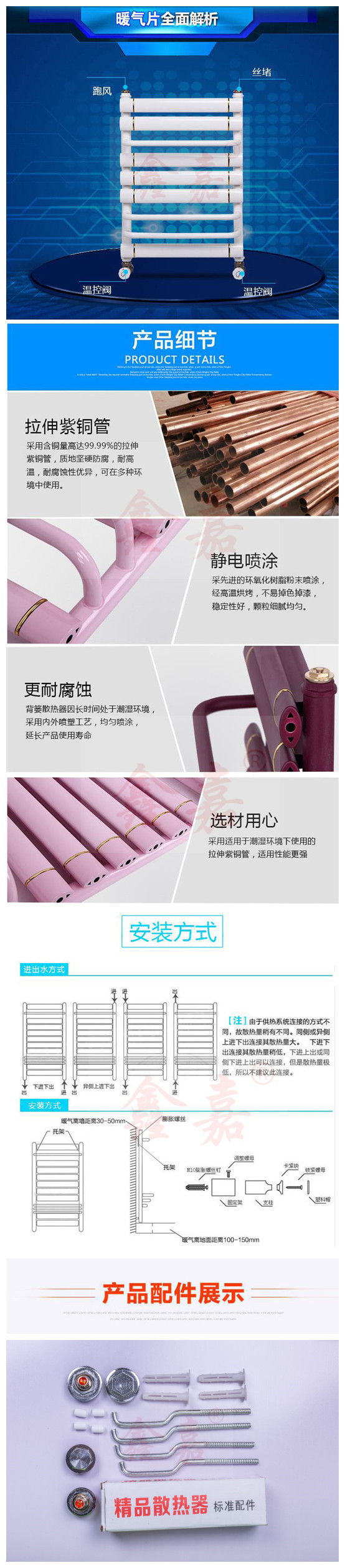 衛(wèi)浴系列散熱器按行業(yè)標(biāo)準(zhǔn)結(jié)合顧客要求組織生產(chǎn)。產(chǎn)品分為銅管、鋼管、銅鋁復(fù)合三種,管徑分為ф25、50×25橢圓管兩種,進(jìn)出水口、中心距、顏色和長(zhǎng)度有多種供客戶選擇。散熱器外表采用先進(jìn)的靜電噴塑和烘干等工藝,色彩亮麗,經(jīng)久耐用,清潔方便。